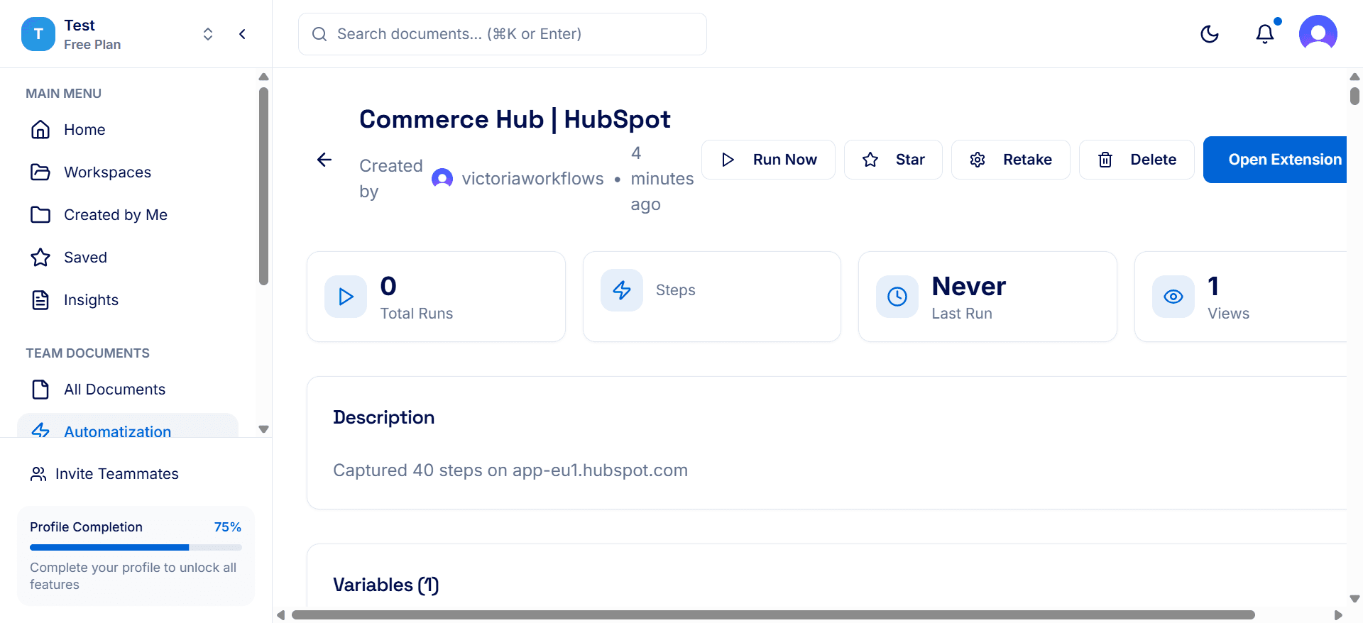 Creating an automated workflow in DocuFast allows you to record a real process once and reuse it whenever needed. DocuFast captures every step as you work and turns it into a reusable automatization.