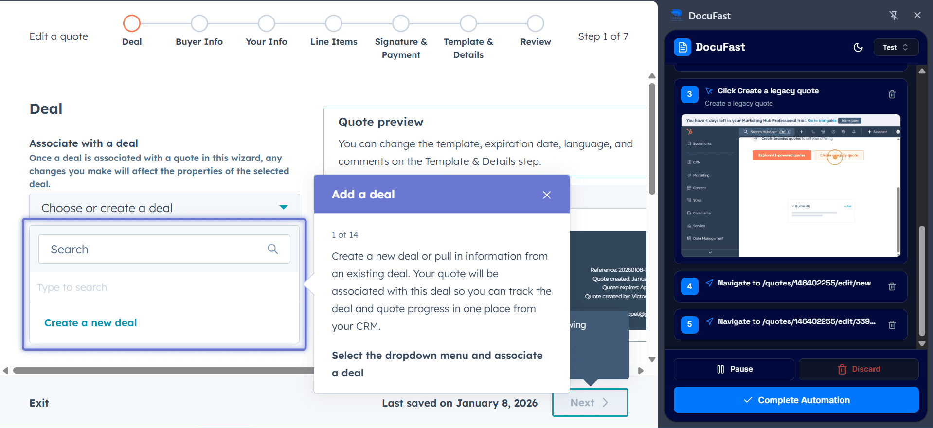 While the automation is recording, you’ll see live progress in the DocuFast sidebar. Each captured action appears as a step with a screenshot.