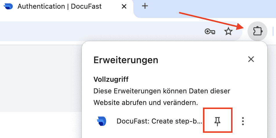Find DocuFast in the list and click the pin icon to keep it visible in your toolbar.