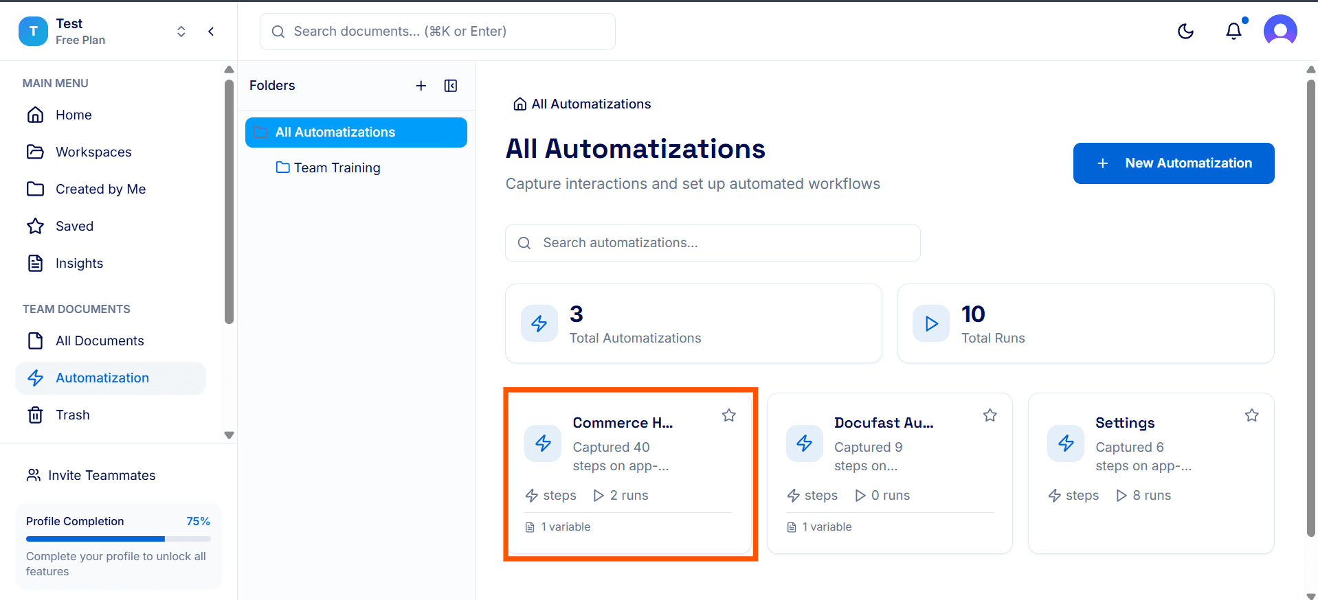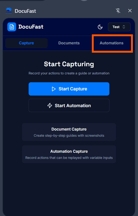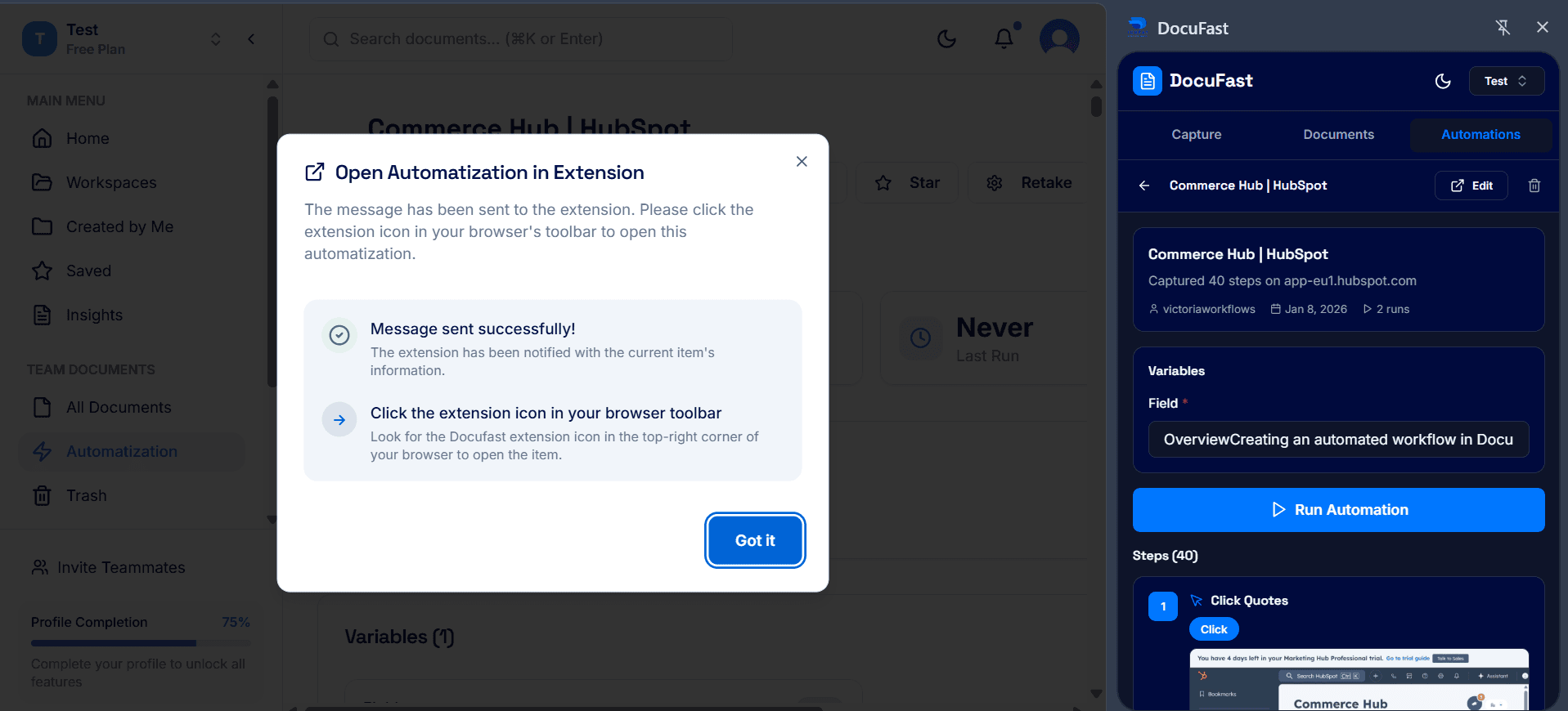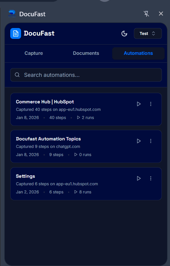 Automated workflows save time and reduce errors by performing repetitive tasks for you. DocuFast provides an easy way to run these workflows , either by opening the workflow guide or using the Automations tab in the extension.