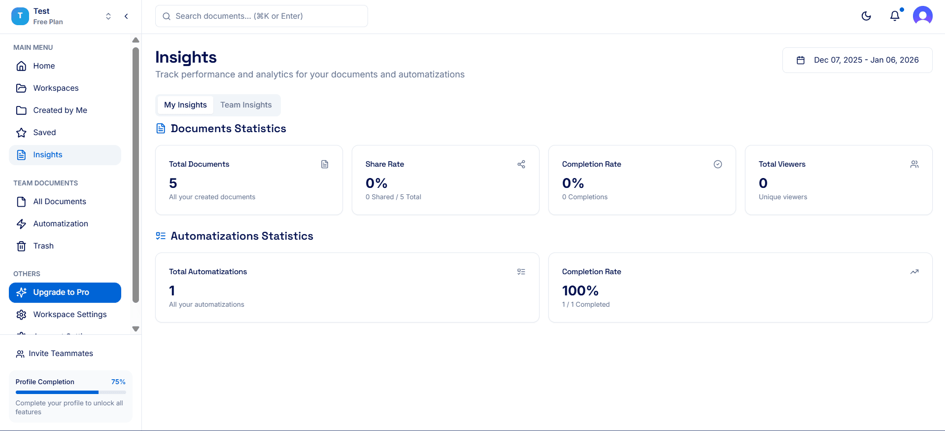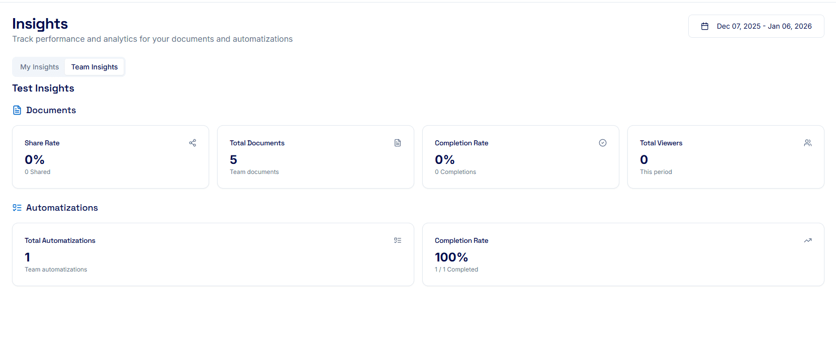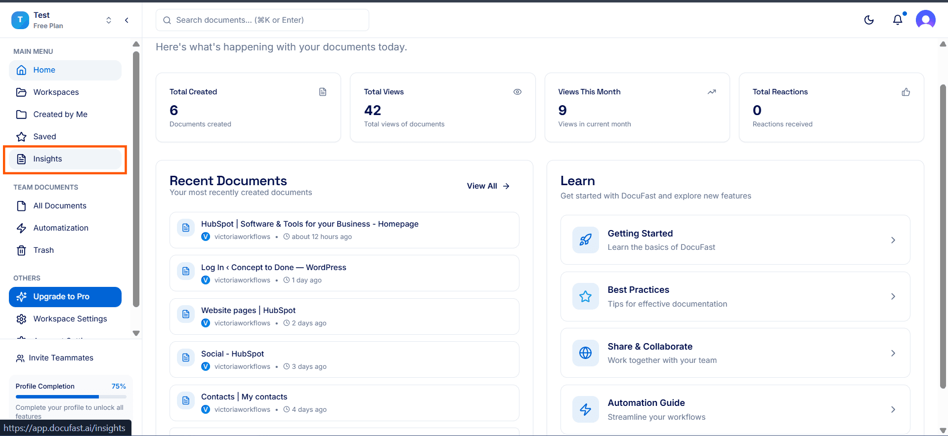 DocuFast provides insights at both individual and team levels, allowing you to track engagement, completion, and overall usage across all shared guides. You get a total view of how your documentation is performing.