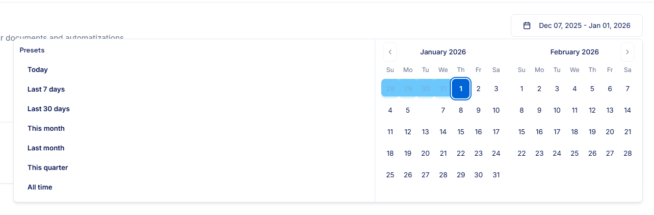 Choose a custom date range or select from preset options (e.g., Last 7 days, Last 30 days, This Month, etc) to view metrics for that timeframe.