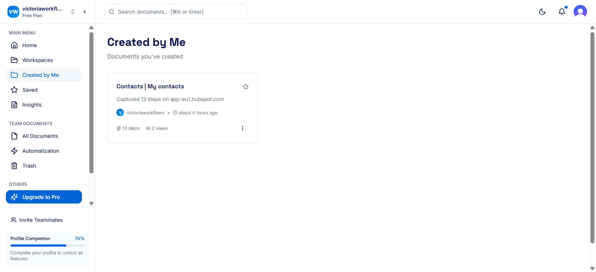 Insights show your documents and automatizations statistics. Switch between your insights and team insights. Here, you can: